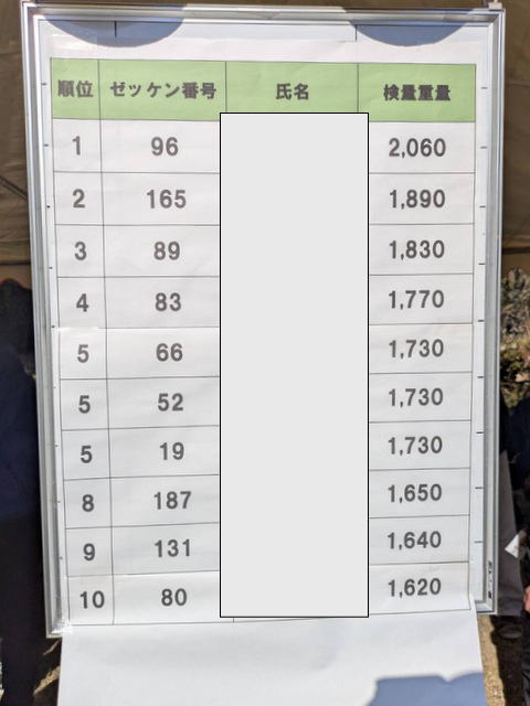 釣り大会に参加したタカさんに頼み、釣り大会結果の写真を送って貰いました。
