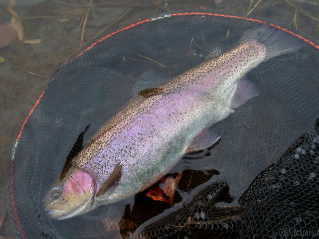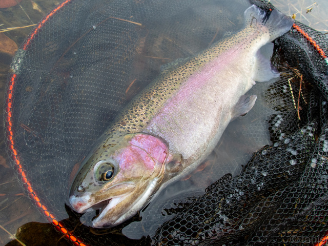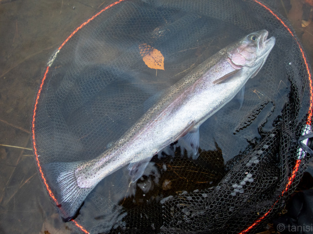 玉網の枠ギリギリの50cmのニジマスだった。