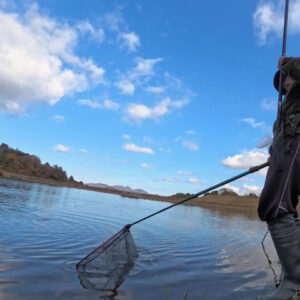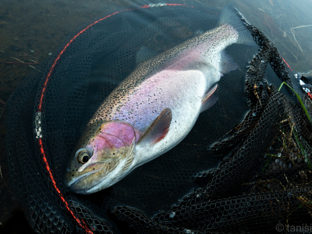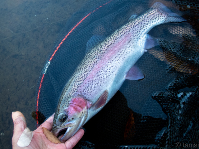 ニジマスのサイズは玉網の枠と比べて判断している。