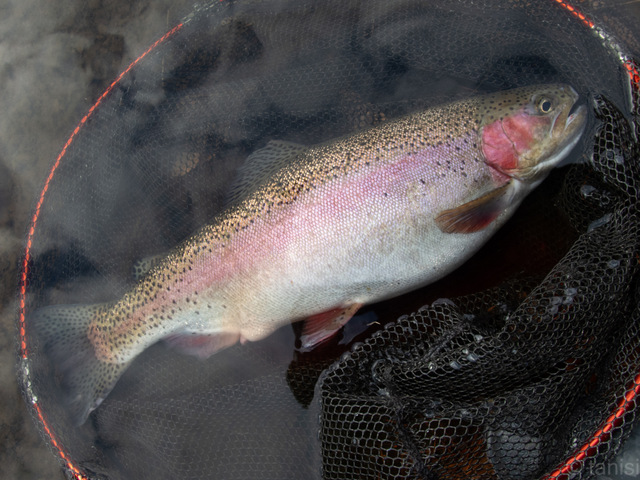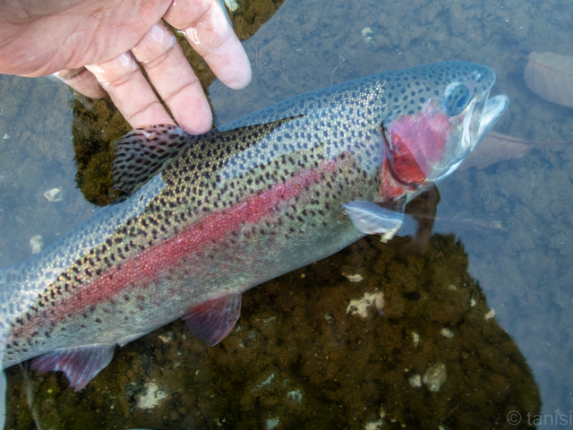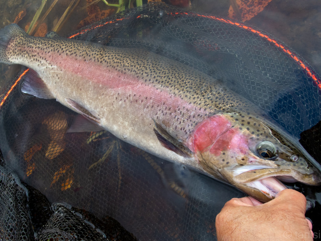 水面に浮かせても沖へ走ろうとして何度も竿を絞り勝負の主導権が魚の方に傾きそうになるのを引き戻した。のべ竿で大型ニジマスとやりとりをするのは実に楽しい。