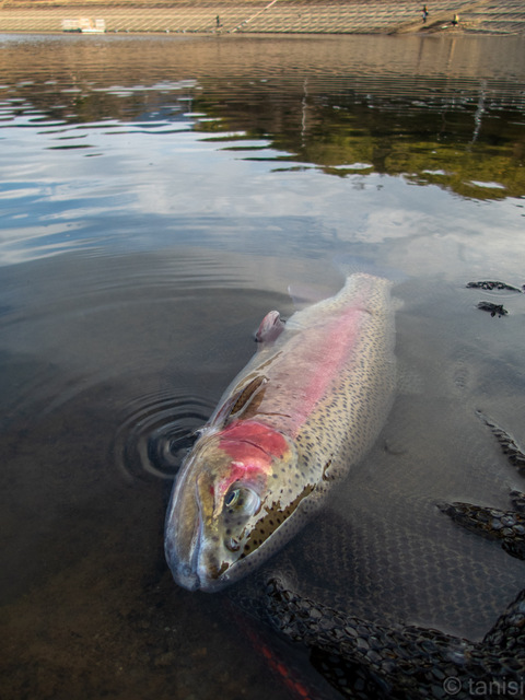 早い段階で40前を掛けた。もくろみ通りニジマスは水の流れのルートを回遊しているようだ。