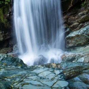 湿気の多い森は斜面から転がった岩に苔が付き、斜面の茶色が緑に覆われる。