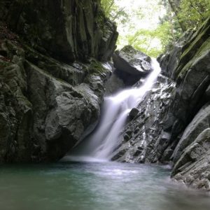 水のない滝を高巻いたり、水のないゴーロをよじ登ったり、一体どんな伏流をしているのか?遡行を続けると水量が復活しアマゴが釣れはじめる。やがて釣り人を拒むかのような核心部、ロープと高い遡行技術が求められる。