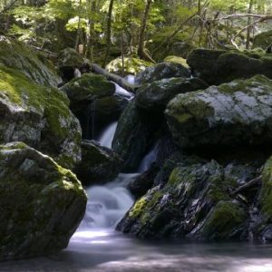 山歩きの途中、原生林の谷間の流れが目に入った。
