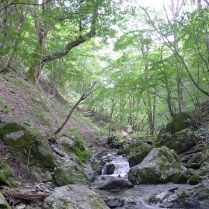 2本目の林道を越えたが魚止めに届かない。タイムアウト寸前、釣りは相棒に任せて帰り道を探る。今回は尾根を150m登って登山道から帰るルートを計画した。(もう、東ルートはコリゴリだ)尾根筋の突端を見つけたが地図上に書かれた林道がない・・・・尾根は林道がないと厳しい斜面、ここまで来るのに疲れ切って、無理矢理登る気にはなれない。仕方なく渓沿いの林道を下っていると石積みの道と交差した。「ここかぁ」迷わず飛びついたが一向に高度を上げない平行な林道・・・・「大丈夫か?」しかし、後戻りする時間は残されていない。休みを取らないで1時間ほど歩くと登ることなく広い尾根筋で登山道と交差した。あとは登山道を下るだけ予定外のルートに救われた。