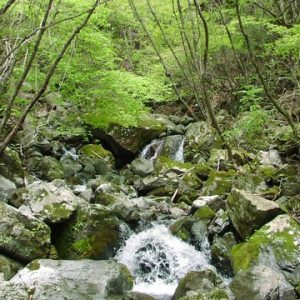 A谷と同じくらいの水量を想像していたが7分目ってところだろうか?チビアマゴが数尾掛かるが青アマゴじゃない。しばらく釣り上がると流れがなくなってしまった。まだ、水線上なので水は崩れて重なった岩の地中を伏流しているようだ。伏流しているなら青アマゴが陸封されている可能性はあると思った。