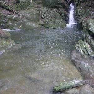 メチャキツい登り、チョット平らになった場所に腰を下ろし一息入れた。連瀑の小さな淵に目をやると8寸と9寸が泳いでいるのが見えた。「行く?」って相棒に聞かれたけど、足はパンパンだし、急斜面を下るのは面倒そうなのでやり過ごそうと思っていた。