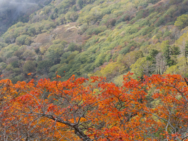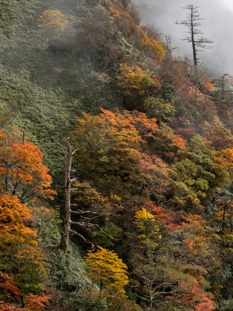 稜線を境に樹林帯の紅葉が影になり暗い感じがするので手前に光が当たった紅葉を配置した。