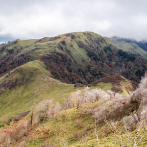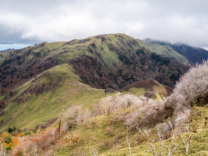 手前に斜めの笹斜面と樹木に挟まれた西熊山を見せるようにした。西熊山の斜面には葉を落とした樹木と紅葉した樹木が入り交じって見えているけど写真的には枯れ木の茶色が支配的になっている。