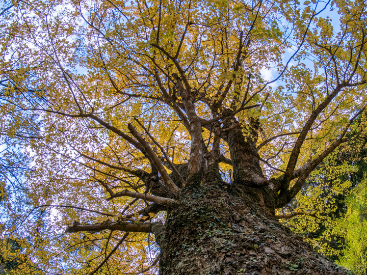 デカくて枝の広げ方が迫力のあるイチョウ、葉々の隙間から青空を覗かせた。