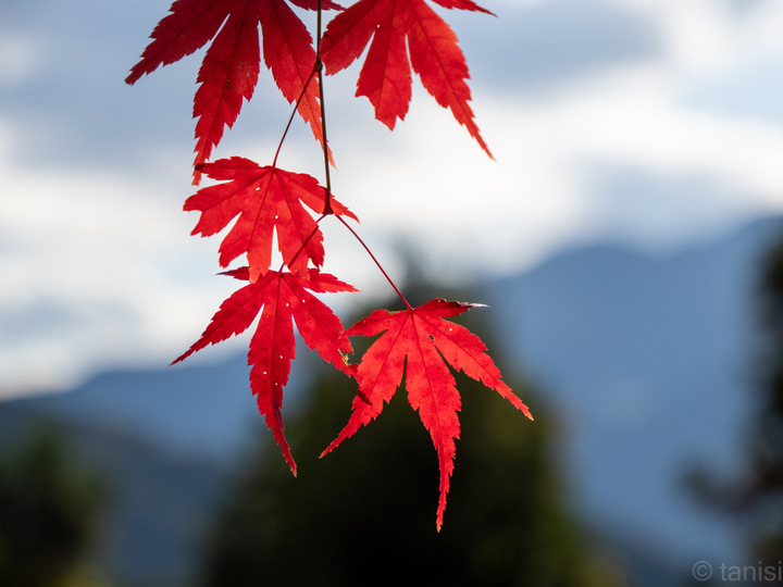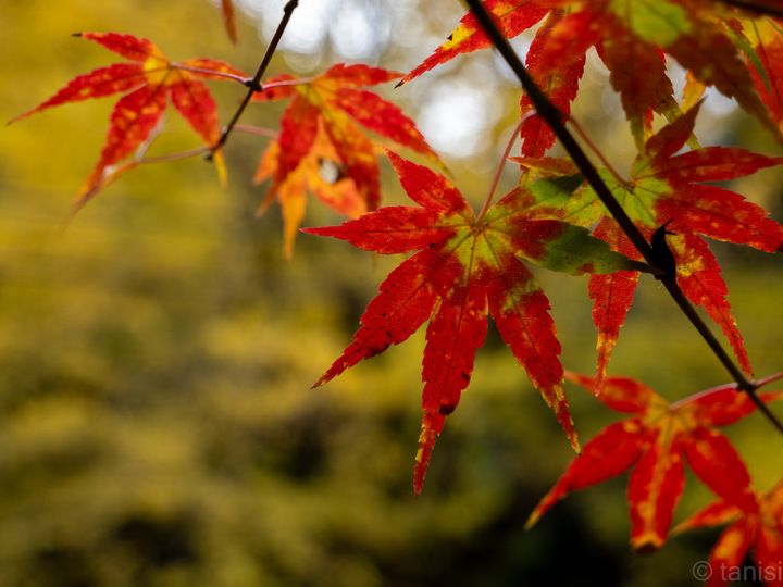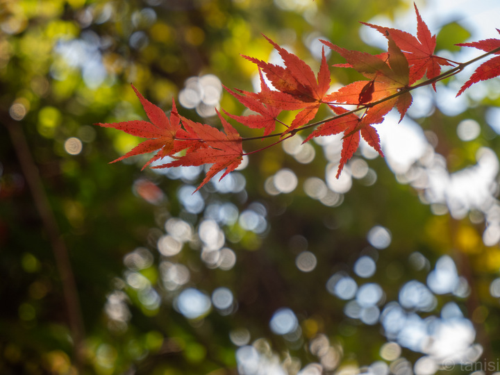 道端なのでガードレールや電線があって全体像を撮るのは難しいなぁ・・・・まだ、色づきはじめたばかりで形の整った紅葉なのでズームアップに耐えうる。葉々の間をすり抜ける光を玉ボケの背景にした。
