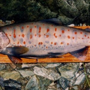 午前6時起床、準備を整えて7時出発、本流との合流点から高度50mの上に電力の取水堤がある。ここからパイプラインに水を引いているコンクリートの取水道を辿り取水堤まで重い足取りで歩いた。取水堤をこえると水量がでてきて、小さなアマゴが走り出す。「待ってました」とばかりに竿を出し釣り始めた。6寸~7寸のアマゴが適度に釣りあがって楽しませてくれた。