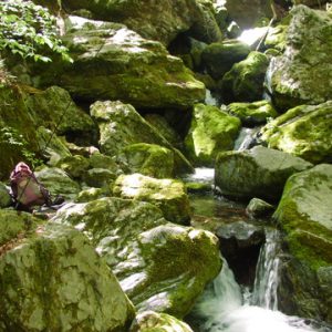二人に別れを告げて、いきなりきつい林道を登り始めた。林道を登り始めてから50分、林道と渓の流れが交差する地点に到着、後から来る二人のためにケルンを3個作った。