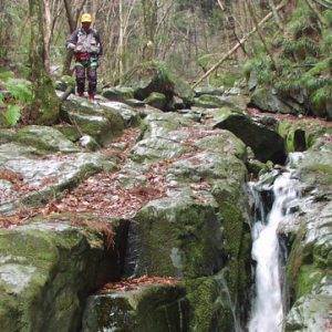 吊橋を渡り林道脇から細い林道を降りると渓にぶつかる。ここから約100mの区間は、遡行し甲斐のあるゴルジェ帯だ 『午前中、チョット・・・・』のつもりであわてて家を出てきたものだからヘルメットを忘れてしまった。ヘルメット無しでこのゴルジェ帯を突破するのは「やばいなぁ」と思ったのだが代用で頭にタオルを巻いて・・・・・(気休めみたいなものだが・・・・)