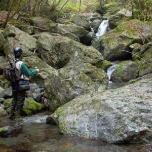 やがて、渓が緩くなり二又に分かれた。ここに虫かごが十数個、どうやらここから発芽卵放流を行っているようだ。この虫かごの数だとだいぶ前から放流があるようだ。序文に書いた『おじさん』の謎が解けたような気がする。たしかあの時も水量が多かった。たぶん発芽卵放流をしていることを知っての釣行だろう。これだけのアマゴがいるなら短い区間の渓流釣りでも十分楽しむことができるだろう。(わたしも楽しんだ)
