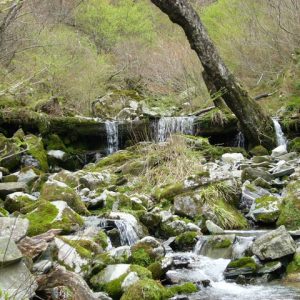 小支流の突端の小尾根道の急斜面から150mしたの渓底に向かう。油断をしていると滑りこける。木に掴まりながら慎重に下降していると、尾根の突端に出くわす。「渓までまだ、高いなぁ・・・」少し戻って支流に降り、小支流沿い林道らしき?獣道を利用して渓に降りた。