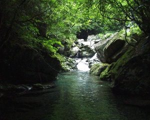 魚止めの滝を越えて何とか8寸アマゴがかかった。あとは御来光の滝を拝むだけだ。御来光の滝が近づくにつれ渓が荒れてきた。大きな岩が重なり合い傾斜が急になりはじめた。「いよいよか?」木々の隙間から白い筋が見え始めた。