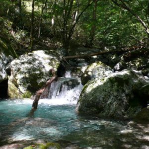 車止めを歩き始めて30分、銀次郎さんの「あっ・・・」という声に振り返って渓を覗き込むと、大きな動物が(1m以上はあったと思う。)物凄い勢いで斜面を下り、渓を渡って対岸の樹木の中へ消えていった。初めは猪だろう思ったが体の色が真っ黒・・・・・剣山山系とは祖谷川を挟んで反対側だし、 最終民家から2kmも離れていない・・・・「まさか???ねぇ」相棒に同意を求める。