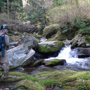 急斜面を立木つたいに4、50m下って連瀑帯の滝壺に竿を出しました。