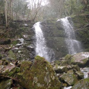 渓流釣り遡行記2011一覧 納涼釣行 核心部にある滝です。15mの豪快な滝、その上に左から2本の小支流が滝となって流れ落ちる。見たこともない深山幽谷の光景の中にいる幸せ苦労して来てよかったと思える瞬間だ。