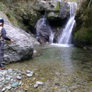 2条の大滝を高巻くと渓は緩くなる。6寸7寸がたまに出るが爆釣モードに入らない。