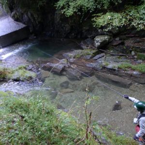 試しで小さな落ち込みに仕掛けを入れてみると1発で7寸が食らいついた。