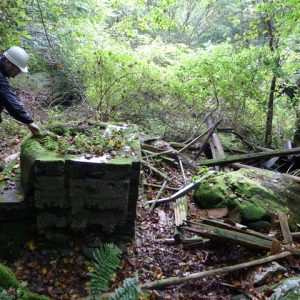 尾根の突端から先にも新しい車道が続いていた。しばらくこの道を下ったが、下流に向かっているようなので車道を外して斜面に取り付いた。急斜面の獣道から小沢を跨ぐ・・・・そろそろ取水の点検道が現れてもいい頃なのだが、記憶違いか点検道と交わったのは渓の直ぐ横だった。