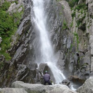 らせん状に落ちてくる様はホラ貝そのもの、初めてこの滝を見たとき滝壺は広く深かったが砂利が堆積して浅く狭くなってしまった。