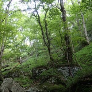ご覧の通り渓は緩やか、東予の厳しい渓に慣れている俺にとっては少々物足りないが1枚岩の川床が続くきれいな渓だ。両岸は常緑樹が多い雑林の原生林になっている。ソロソロ陽の光が渓に届いてもいい頃なのだが樹木が密集しているのでこんな広い渓なのに薄くらい。