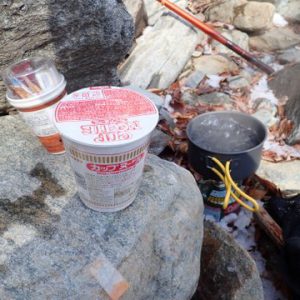 渓でラーメンを作るとお湯の沸点が低かったり、気温が低くいのでお湯が冷えるのが早かったりするので少し硬めの麺になることが多いがチキンラーメンは丁度いい柔らかさ、そして子供の頃食べた味と変わらない懐かしいさに好感が持てた。