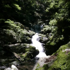 原生林の渓ならではの風景、力尽きて倒れたとしても谷の流れを変えてしまうほどの存在感は神が宿るに相応しい場所だ。