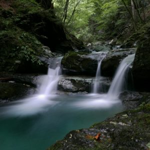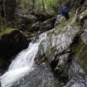 尾根を下る途中、水量が少ないけど雰囲気が良さそうな滝が見えたので谷に降りて竿を出した。