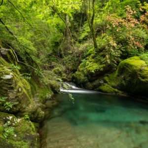 入り口から巨木が立ち大岩は苔に覆われた緑の渓・・・・遡行を続ければ緑は更に深くなり原生林の懐に包まれている心地よさを感じずにはいられない。