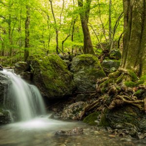 渓流釣り遡行記2021一覧 最源流の渓原生林の巨木と苔がマッチしていた。湿気に満ちた空気は緑の深さを強調する。高さのない滝だが水の勢いに力強さが美しい渓流釣り遡行記2021 一覧2021年最終釣行2021/9/29 晴れ/曇り 吉野川水系...