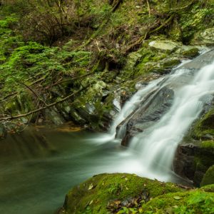 渓流釣り遡行記2021一覧 最源流の渓原生林の巨木と苔がマッチしていた。湿気に満ちた空気は緑の深さを強調する。高さのない滝だが水の勢いに力強さが美しい渓流釣り遡行記2021 一覧2021年最終釣行2021/9/29 晴れ/曇り 吉野川水系...
