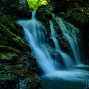 少し濃くなった新緑の隙間から漏れてくる光が差し込み美渓が更に美しい光景になる。