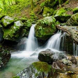 重なり合った岩の間を水が流れている。