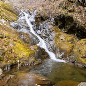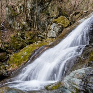 3段の美しい滝を写真に納めようと少し手前の尾根を下降した。水の流れている岩が黒くなっているカッコイイ滝、盛期だと木の枝についた葉で3段目が隠れてしまうのだが芽吹く前なので3段滝の全景を写真に納めることができた。