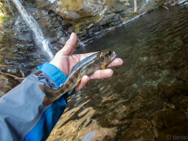 滝下の深みでアマゴを掛けた。流れの緩い淵底でジッとしているより流れの先頭に出て積極的に餌を追うようになってきた。