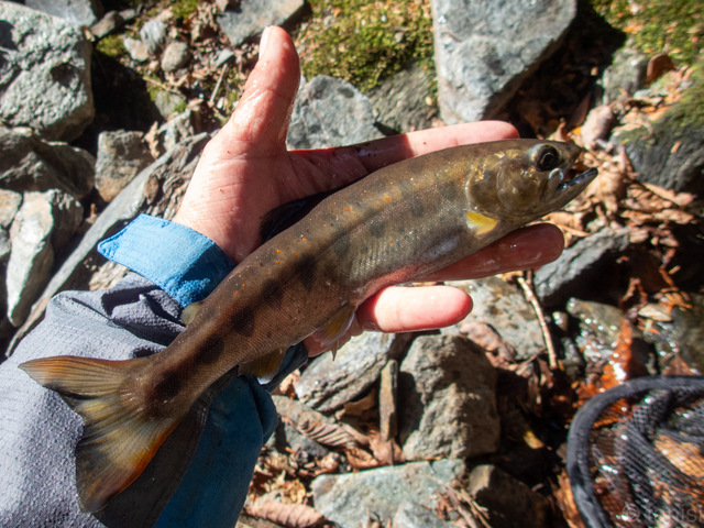 本日の釣行の目的はコイツに逢うためだ。数年前は上流にしか居なかったけど最近は中流域まで広がりをみせ固有化している。雄は尖った顔つきと鰭の赤い縁取りも魅力的だ。