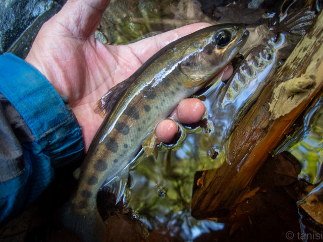膝まで立ち込み落ち込み間際を狙う、ウエーダーを履いているが薄い素材を透し水の冷たさが足に伝わり1、2分しか立ち込んで居られない。冷たさに耐え、倒木の下に潜ろうとするアマゴの動きを躱し取り込んだ8寸は陽の下に翳すと黄金色に輝くアマゴ