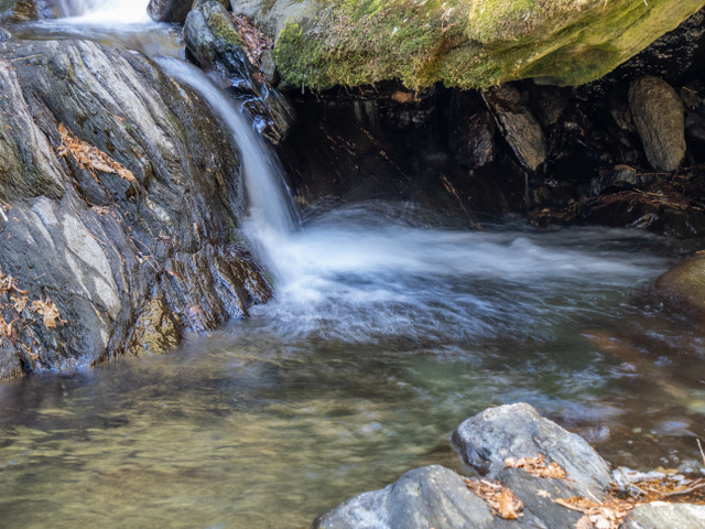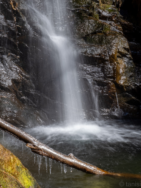 光と影が複雑な境界ラインでで構成されているところが面白い。写真は減算と言われるように不要なものを排除してスッキリ見せることが多いけど下の岩壁に張り付いた氷の塊がプラスしたことでいいポイントになった。