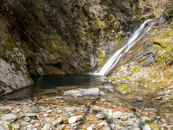 優雅に水が滑り落ちる斜滝と深さを持った滝壺