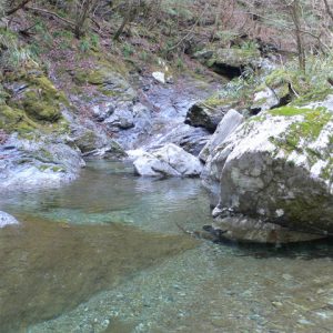ふたまたを過ぎるまで険悪な渓相だが、二又を過ぎたあたりから開けた谷になる。それからしばらく進むと滝の連続帯となる。水量があればこの上からが面白いかもしれないが釣り大会の集合時間があるので滝を越えた林道が近くなる付近の二又で納竿