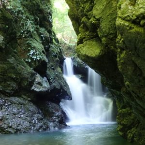 正面にある滝を約40m登り支流に入る。滝は3段構えになっているが近づくことができない。