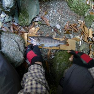 大滝前の少し広い浅淵 淵尻に7寸クラスが3匹と5、6寸が数匹浮いている。魚の近くに餌を入れたのでは今までの繰り返しになるように思えたので落ち込みから餌を流す作戦に変更した。落ち込みから仕掛けが上手く流れたが渕尻のアマゴは動かない・・・・