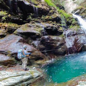 左の落ち込みに仕掛けを入れ1mくらい流れたところでアマゴがくねり白い腹が見えた。