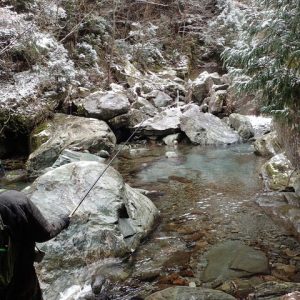 車止めの100m下流に、いい感じの淵がある。あわよくば8寸・・・・ダメなら納竿
