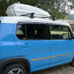 取付はルーフボックスが左開きなので、荷物が取り出しやすいようにハスラーの左いっぱいに載せた。
