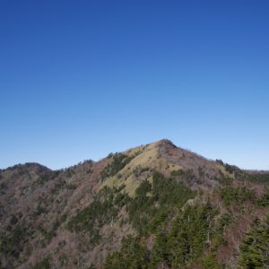 初めは急斜面を下ります。小ピークを3つ越えて剣山スーパー林道に至ります。赤テープが疎らにあるだけでルートがハッキリしません。